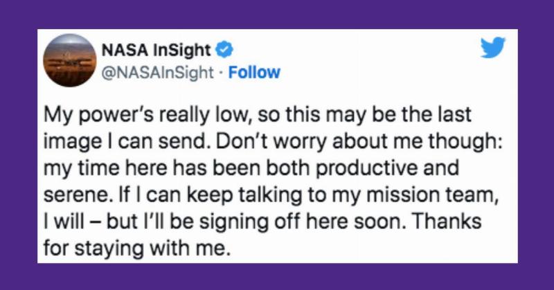 It seems like InSight had developed a strong bond with the people at NASA. The robot would tweet statements like: "everyone should be so lucky to have a supportive community like you all." It would encourage people to send their "well-wishes to me or my team back on Earth, I’m sure they’d love to read them."